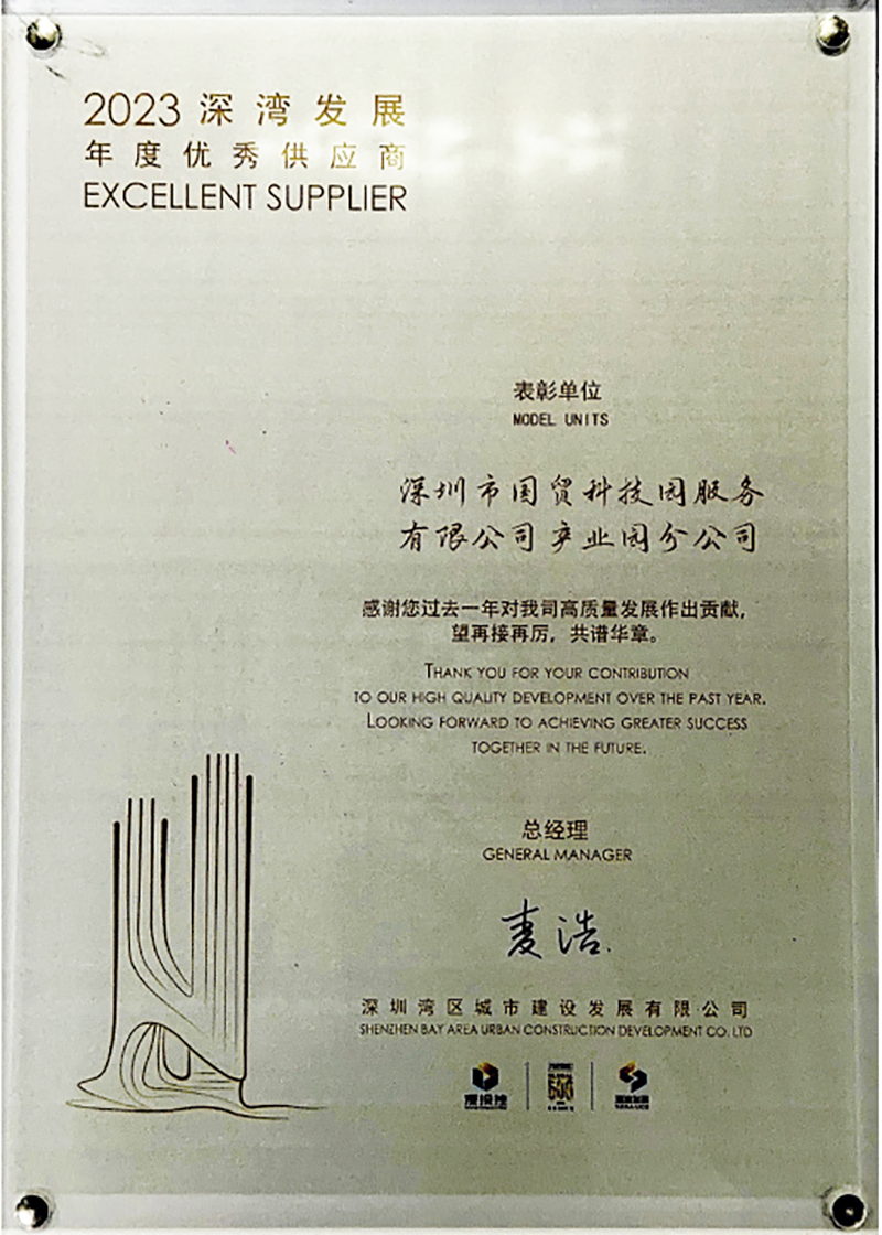 近日,在深圳湾区城市建设发展有限公司年度供应商评选中,国贸科技园公司(产业园分公司)再次获评“2023深湾发展年度优秀供应商”。