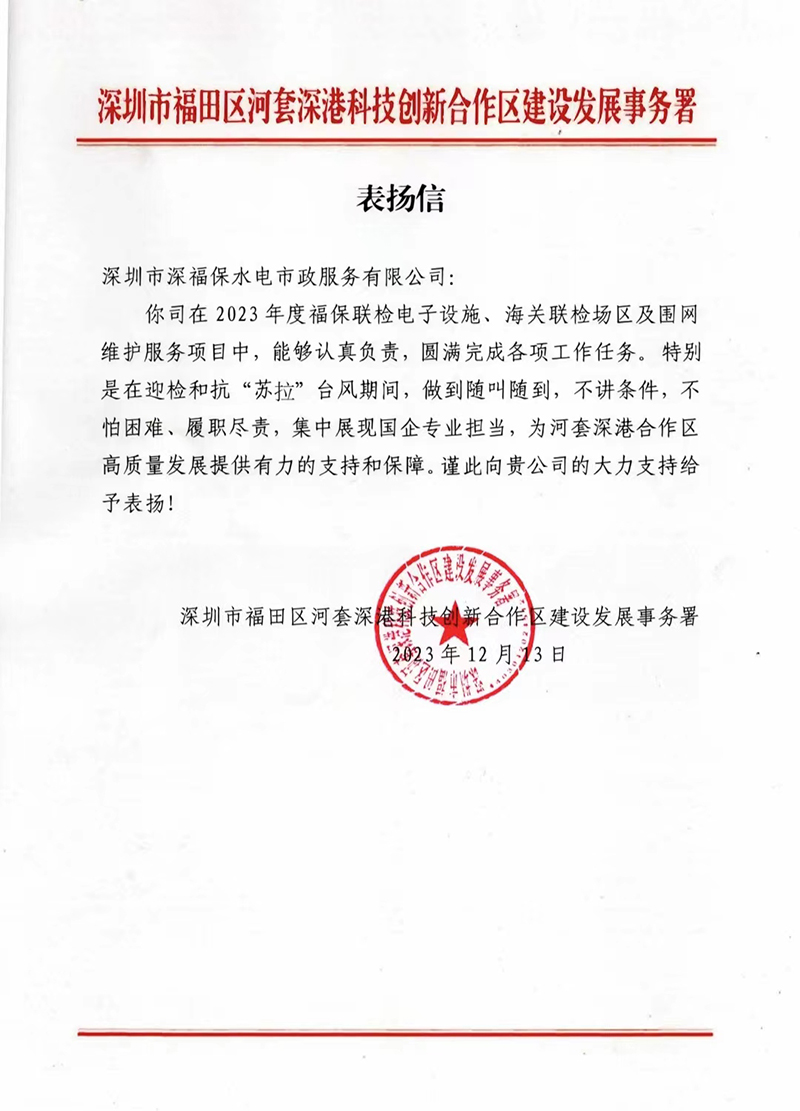 近日,福保水电公司收到深圳市福田区河套深港科技创新合作区建设发展事务署的表扬信,对福保水电公司在2023年度福保联检电子设施、海关联检场区及围网维护服务项目中所表现出的专业素养和服务精神给予了高度评价。