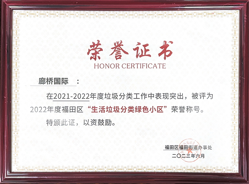 近日,国贸美生活公司廊桥国际服务中心荣获福田区2022年“生活垃圾分类绿色小区”荣誉称号。