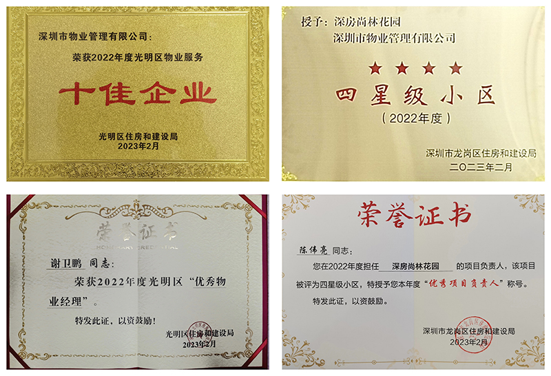 近日,光明区、龙岗区住建系统先后召开年度工作会议,表彰优秀物管企业、项目及相关从业人员。深物公司荣获2022年度光明区物业服务“十佳企业”称号,在管项目尚林花园小区荣获龙岗区2022年度“四星级小区”称号,传麒山管理处项目经理谢卫鹏、尚林花园管理处项目经理陈伟亮,分别获评2022年度光明区优秀物业经理、2022年度龙岗区优秀项目负责人。