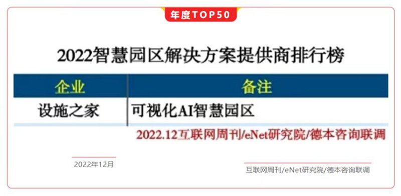 近日,由中国科学院旗下权威媒体《互联网周刊》联合德本咨询、eNet研究院评选的“2022年智慧园区解决方案提供商排行榜”重磅发布,设施之家可视化AI智慧园区连续3年入选榜单TOP50。