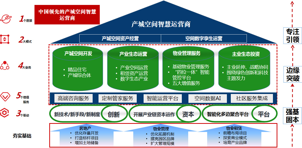“1 个愿景+2 大板块+3 个驱动+4 大业务+5 个增值服务”的“12345”总体发展思路。围绕“产城空间 资产经营”和“空间数字生态运营”两大核心模式精准发力, 通过“主业延伸、边缘突破”,重点发展以产城空间开发、 产业生态运营、物业管理服务、主业生态投资为主的四大业 务,快速布局和嫁接高端咨询服务、定制管家服务、智能运 营平台、数据挖掘利用、商业生态圈整合等五大增值服务, 以科技创新为第一驱动力,充分发挥资金资本的撬动作用, 建设门户型智能管控服务平台,立足深圳,以粤港澳大都市 圈及周边地区为扩张区域,重点承担深投控辐射圈层的网络 布局分工,构建智能社会基点功能,打造中国领先的产城空 间智慧运营商。