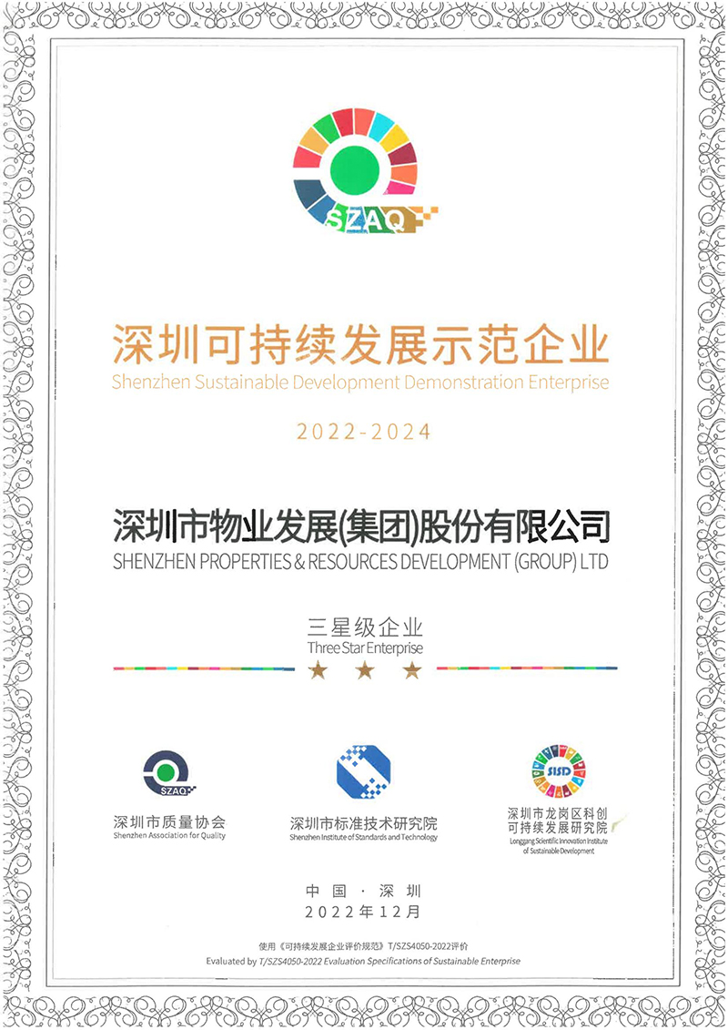 2023-04-04深物业集团获评“深圳可持续发展示范企业”荣誉称号3月31日,由深圳市质量协会主办的2022年度深圳质量年会暨质量基础设施促产业高质量发展大会成功举办,深物业集团获评“深圳可持续发展示范企业(三星级企业)”荣誉称号。 -