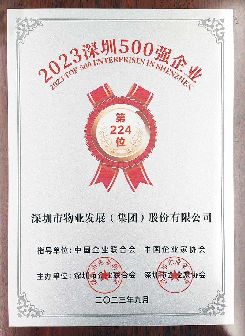 2023-11-21深物业集团荣获“2023深圳500强企业”称号近日,深圳市企业联合会、深圳市企业家协会发布“2023深圳500强企业”榜单,深物业集团凭借卓越的综合实力再度上榜,位列第224位。 -