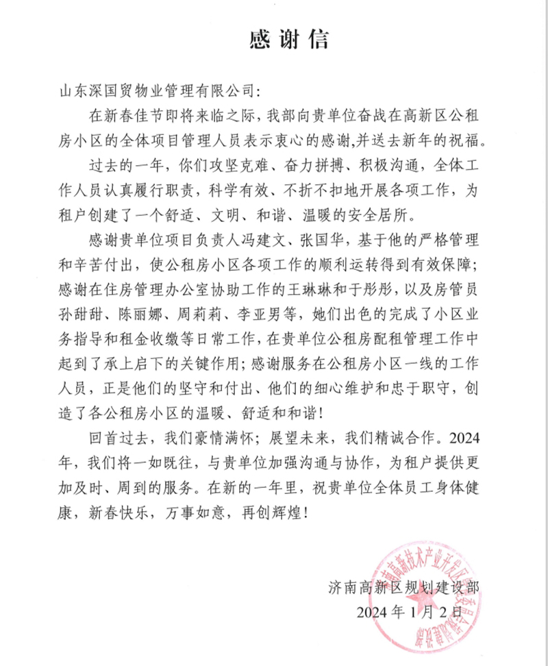 2024-01-25国贸物业山东公司多项工作获赞近日,国贸物业山东公司秉持“源于心诚,臻于完美”的服务理念,在多项工作上取得优异成绩,获得多方点赞。 -