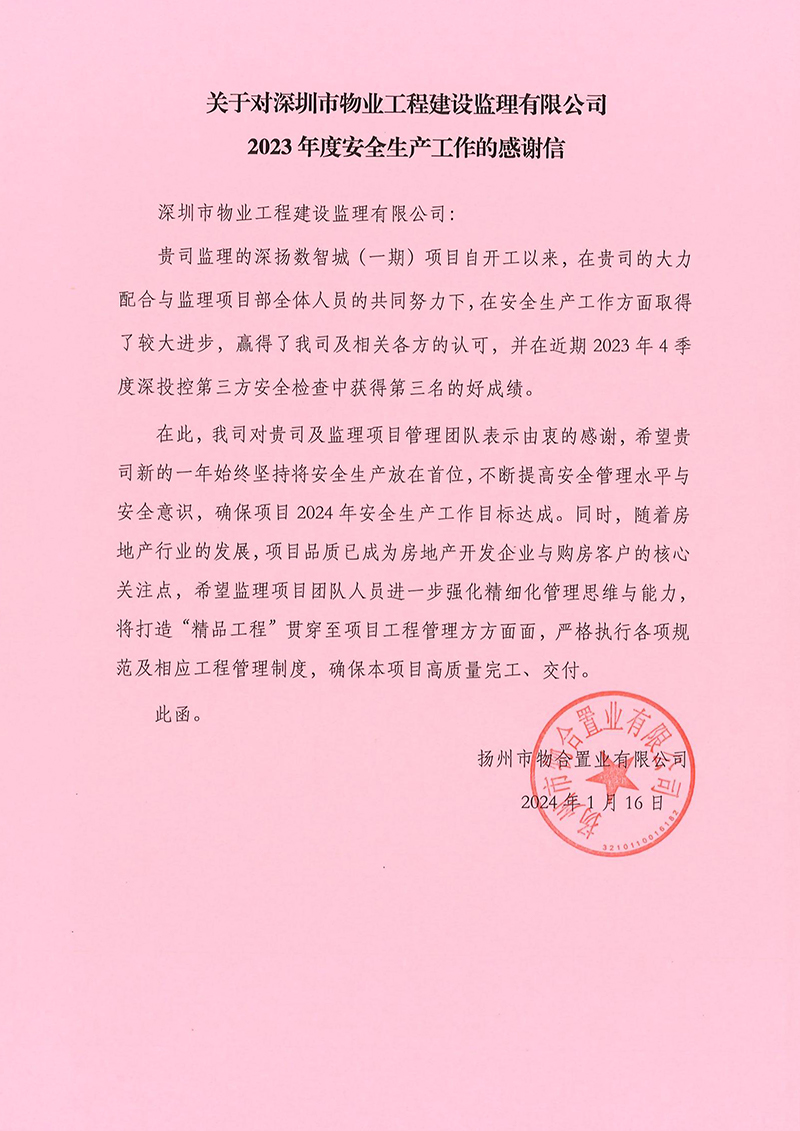 2024-01-24物业监理公司获业主单位感谢信近日,物业监理公司监理的深扬数智城(一期)项目在2023年第4季度深投控第三方安全检查中获得第三名的好成绩。物业监理公司收到扬州市物合置业有限公司的感谢信,对物业监理公司提供的监理服务表示充分肯定及由衷感谢。 -