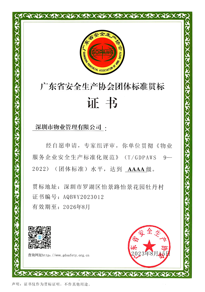 2023-08-21深物公司取得《物业服务企业安全生产标准化规范》团体标准AAAA贯标8月15日,经广东省安全生产协会第三方安全技术机构专家组评审,认定深物公司取得《物业服务企业安全生产标准化规范》(T/GDPAWS9-2022)团体标准AAAA(下称“4A”)贯标。