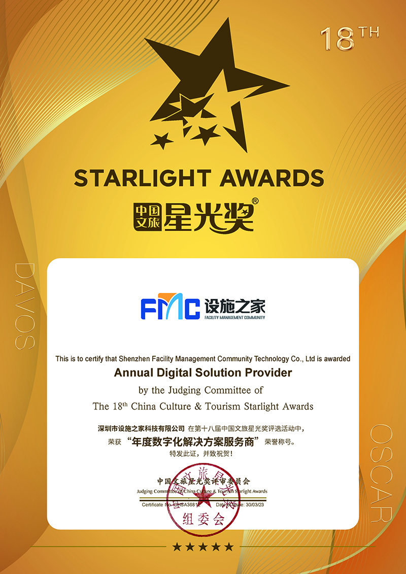 2023-04-11设施之家荣膺中国文旅星光奖“年度数字化解决方案服务商”称号近日,2023 AHF亚洲酒店及旅游业论坛暨第十八届中国文旅星光奖颁奖典礼盛大举行。设施之家凭借高品质的数字化服务能力,荣膺第十八届中国文旅星光奖“年度数字化解决方案服务商”称号。 -