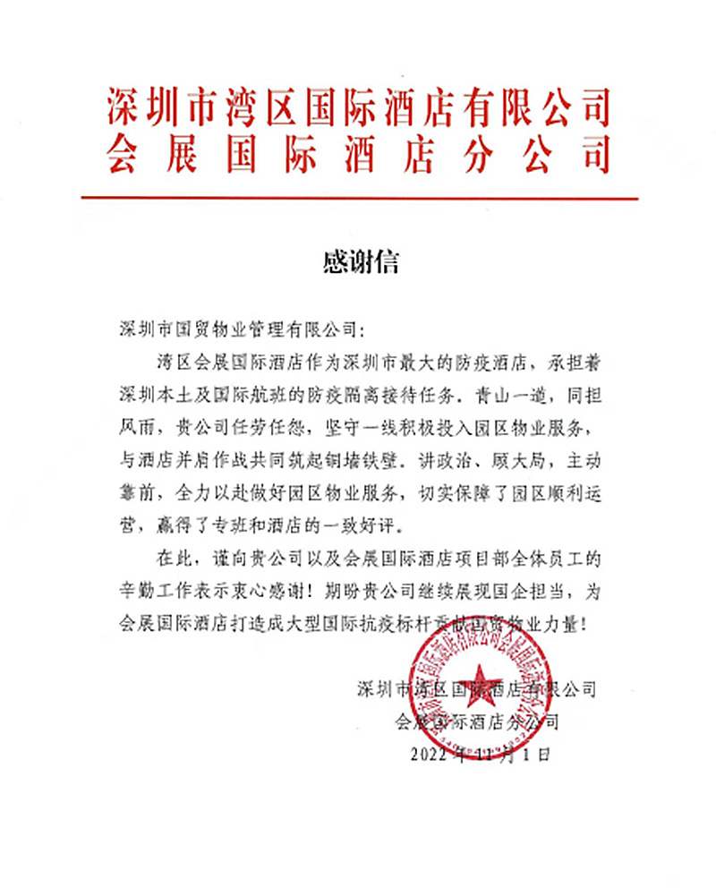 2022-11-18国贸科技园公司会展国际酒店项目团队获赞近日,国贸科技园公司收到一封来自湾区会展国际酒店的感谢信,对公司会展国际酒店项目服务团队的专业物业服务保障工作给予充分认可和肯定。