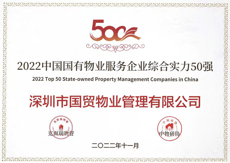2022-11-18国贸物管公司荣获“中国国有物业服务 企业综合实力50强”等八项荣誉国贸物管公司凭借领先的服务理念和优质的服务品质,荣获八项荣誉。 -