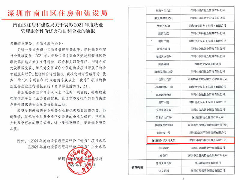 2022-07-13国贸科技园公司创智大厦项目获评南山区住房和建设局2021年度物业管理服务评价“优秀”项目近日,南山区住房和建设局发布《南山区住房和建设局关于表彰2021年度物业管理服务评价优秀项目和企业的通报》,国贸科技园产业园分公司创智大厦项目获评2021年度物业管理服务评价“优秀”项目。