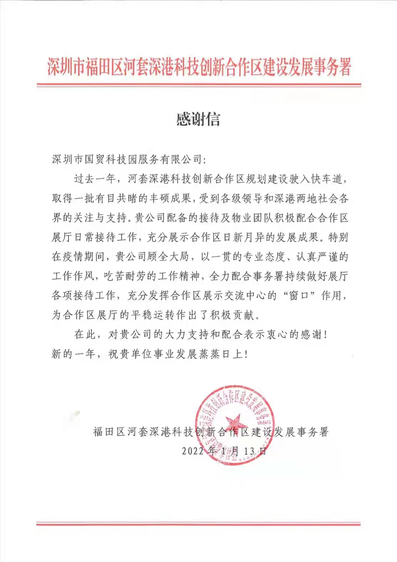 2022-02-23国贸科技园公司深港科创项目部获福田区河套深港科技创新合作区建设发展事务署点赞近日,国贸科技园公司收到一封来自深圳市福田区河套深港科技创新建设发展事务署的感谢信,高度认可深港科创项目部物业团队一年以来为河套深港科技创新合作区展示中心提供的物业管理服务。 -