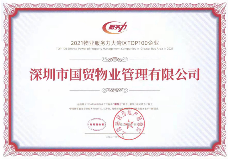 2022-01-05国贸物管公司荣获“2021物业服务力大湾区百强企业”等多项荣誉称号12月30日,克而瑞物管、中物研协、易居房地产研究院联合举办“2021粤港澳大湾区物业服务力百强峰会”并揭晓榜单,国贸物管公司荣获“2021物业服务力大湾区百强企业”、“2021大湾区产业园区物业服务力TOP5企业”、“2021大湾区产业园区物业服务力标杆项目”等多项荣誉称号。 -