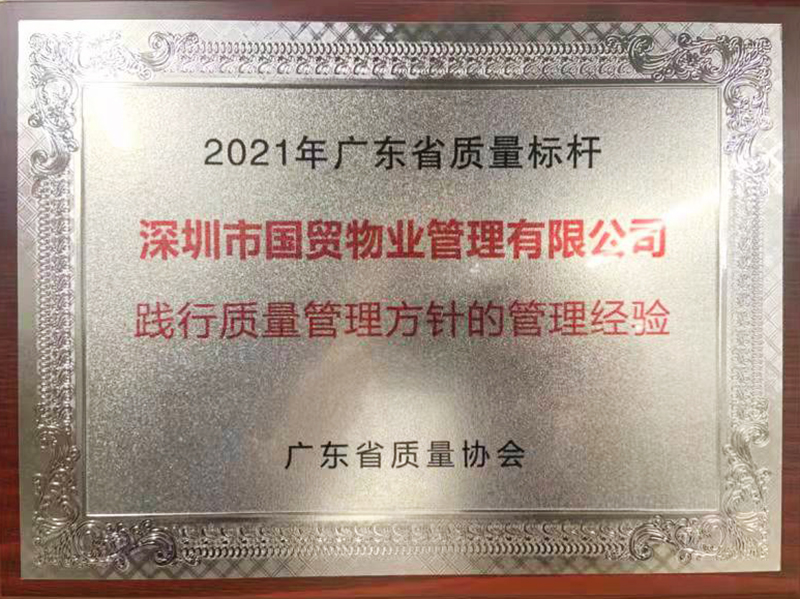2021-12-24国贸物管公司荣获“2021年广东省质量标杆企业”称号近日,广东省质量协会公布2021年广东省质量标杆典型评选结果,经广东省各地市质协、行业协会推荐、材料评审等环节,国贸物管公司凭借报送作品《深圳市国贸物业管理有限公司践行质量管理方针的管理经验》,荣获“2021年广东省质量标杆企业”称号。 -