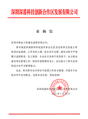 2021-08-05物业监理公司负责深港科创公司监理项目获赞近日,物业监理公司收到深港科创公司的感谢信,对物业监理公司负责监理深港国际科技园共享会议室及运营单元改造工程项目表示高度认可。 -