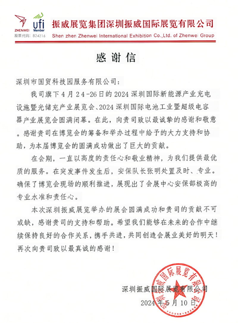 2024-05-31国贸科技园公司深圳会展中心项目安防工作获赞国贸科技园公司深圳会展中心项目获得主办方深圳振威国际展览有限公司赠予的感谢信一封,对项目物业团队在博览会筹备、举办过程中给予的大力支持表示感谢及肯定。 -
