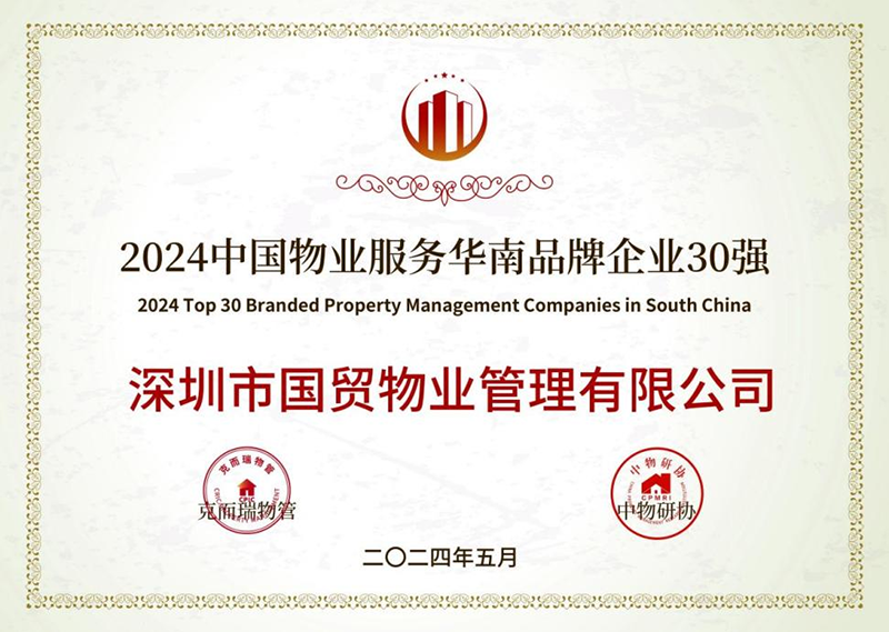 2024-05-29国贸物业荣获2024物业服务力百强企业等多项荣誉深圳市国贸物业管理有限公司荣获“2024中国物业服务力百强企业”“2024中国园区物业服务力TOP20企业”“2024中国物业FM设施管理领先企业”“2024年度服务力标杆项目——深圳湾科技生态园”“2024中国物业服务华南品牌企业30强”多个奖项。 -